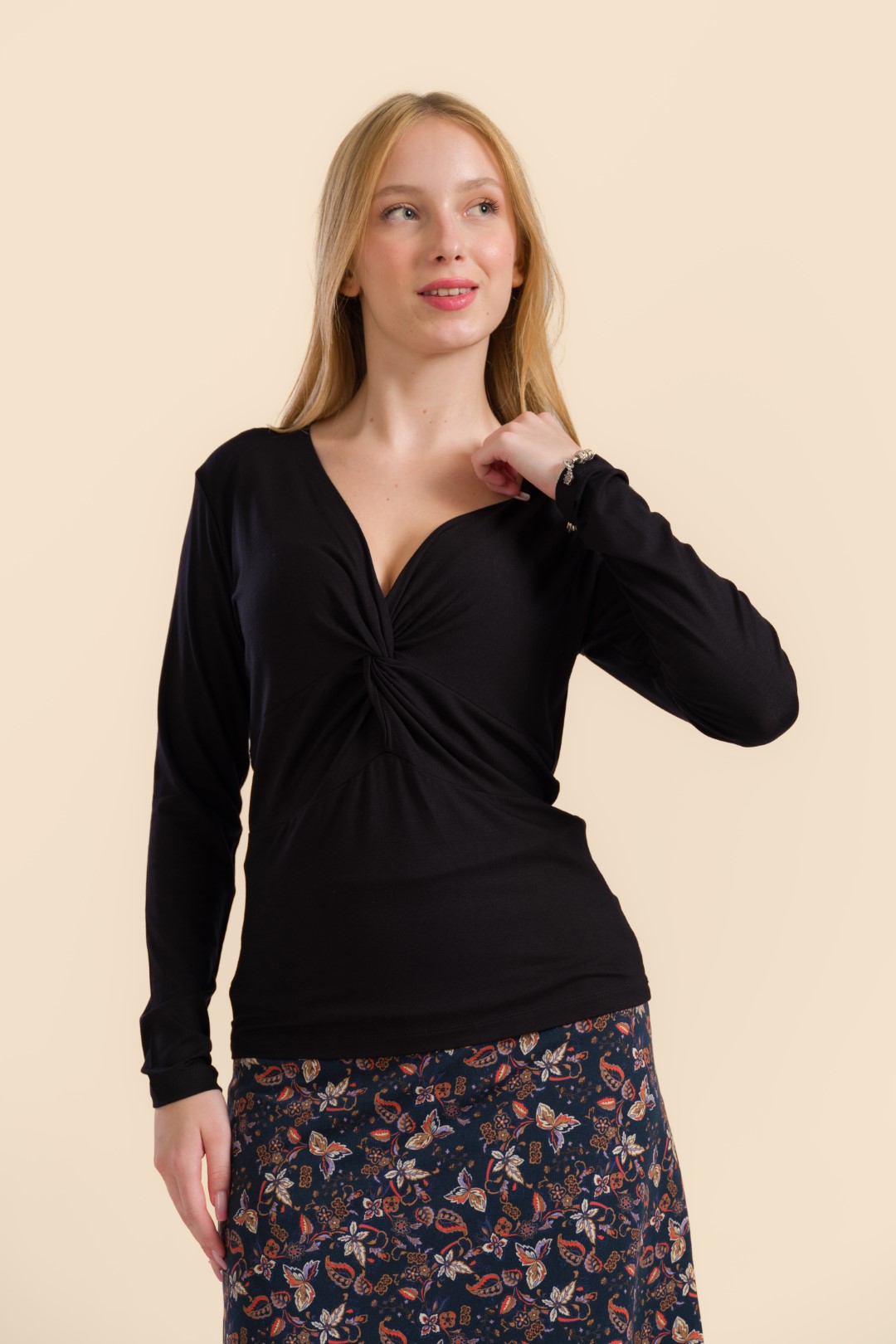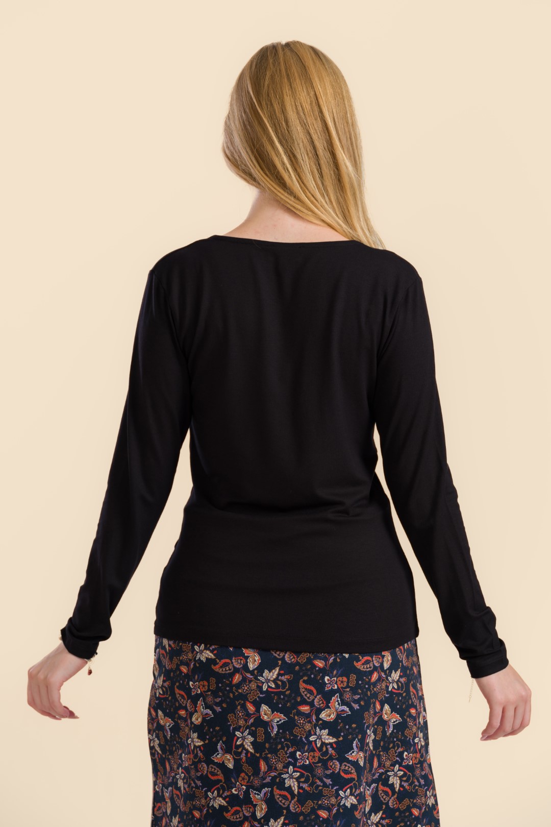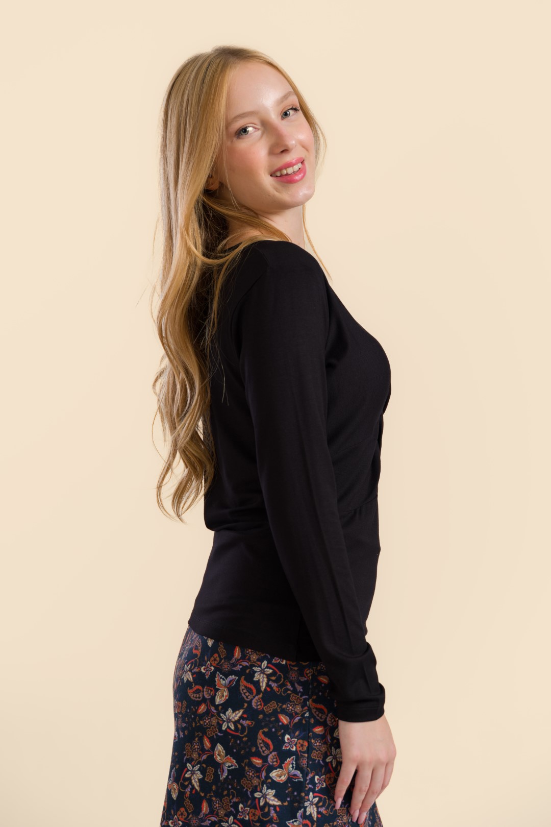 Omarm de tijdloze elegantie van de Angela Top in een diepe zwarte tint, uitgevoerd in zachte Ecovero-viscose. Deze top biedt zowel stijl als comfort, met een flatterende pasvorm die moeiteloos te combineren is. Perfect voor zowel casual als chique gelegenheden.