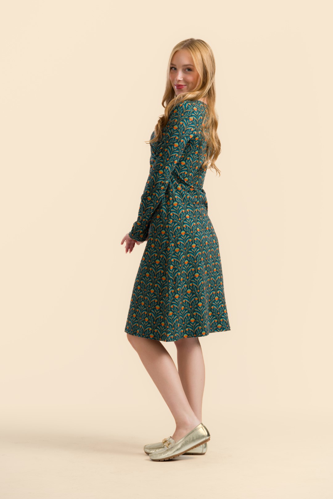 De Chrissy Cross Dress is een flatterende overslagjurk met een elegant A-lijn silhouet. De print in warme tinten geeft deze jurk een kunstzinnige en vrouwelijke uitstraling.