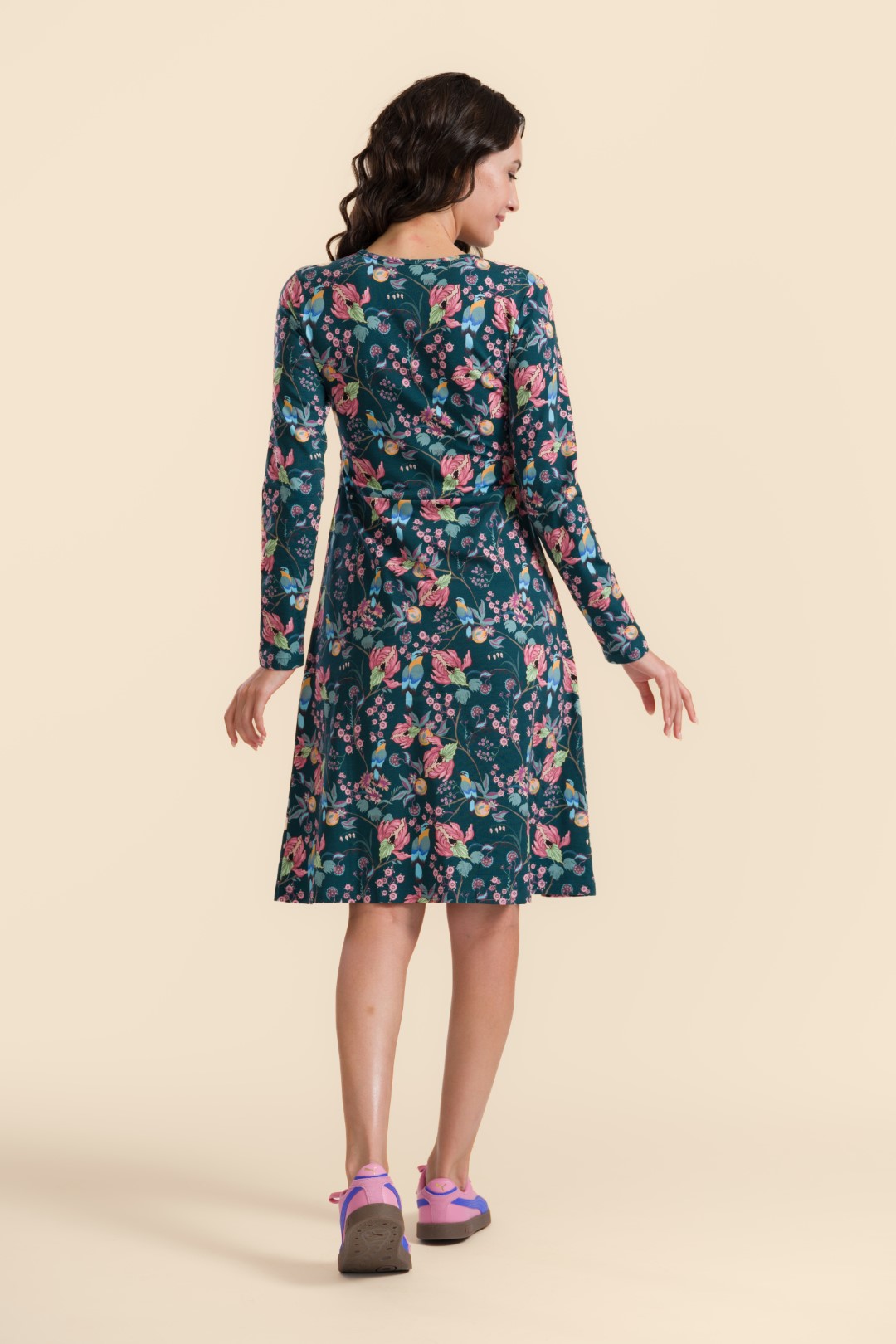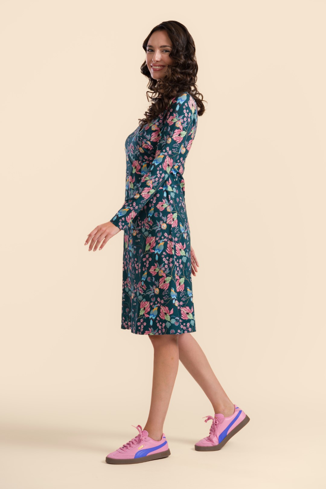 De Chrissy Cross Dress is een flatterende overslagjurk die moeiteloos elegantie en comfort verenigt. De Birdy-print geeft een vrolijke, speelse uitstraling.