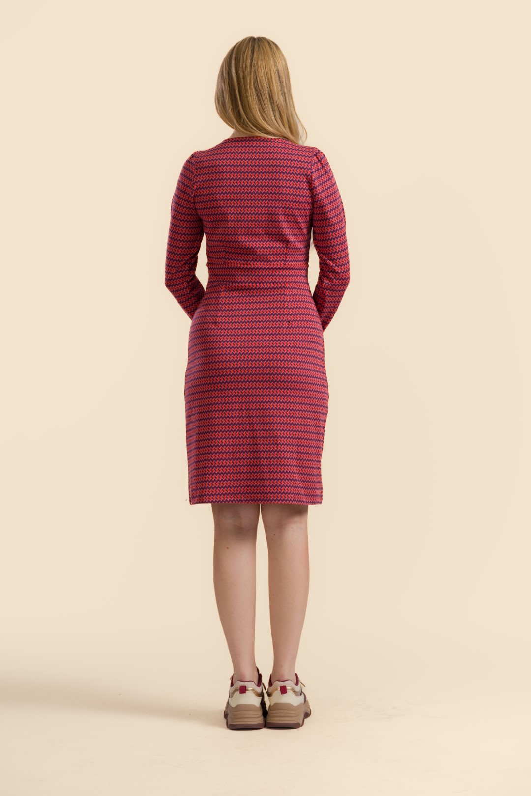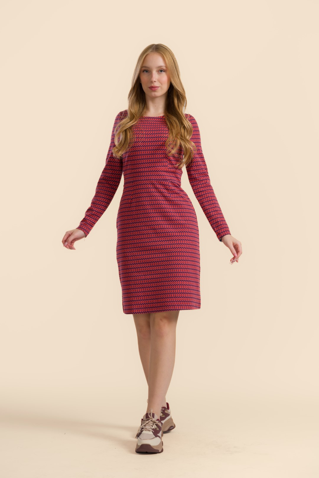 Modern en stijlvol: de Jacquard Elegance print brengt een subtiel geometrisch patroon in warme rood- en paartinten. Deze jurk straalt klasse uit en voelt tegelijkertijd heerlijk comfortabel aan.
