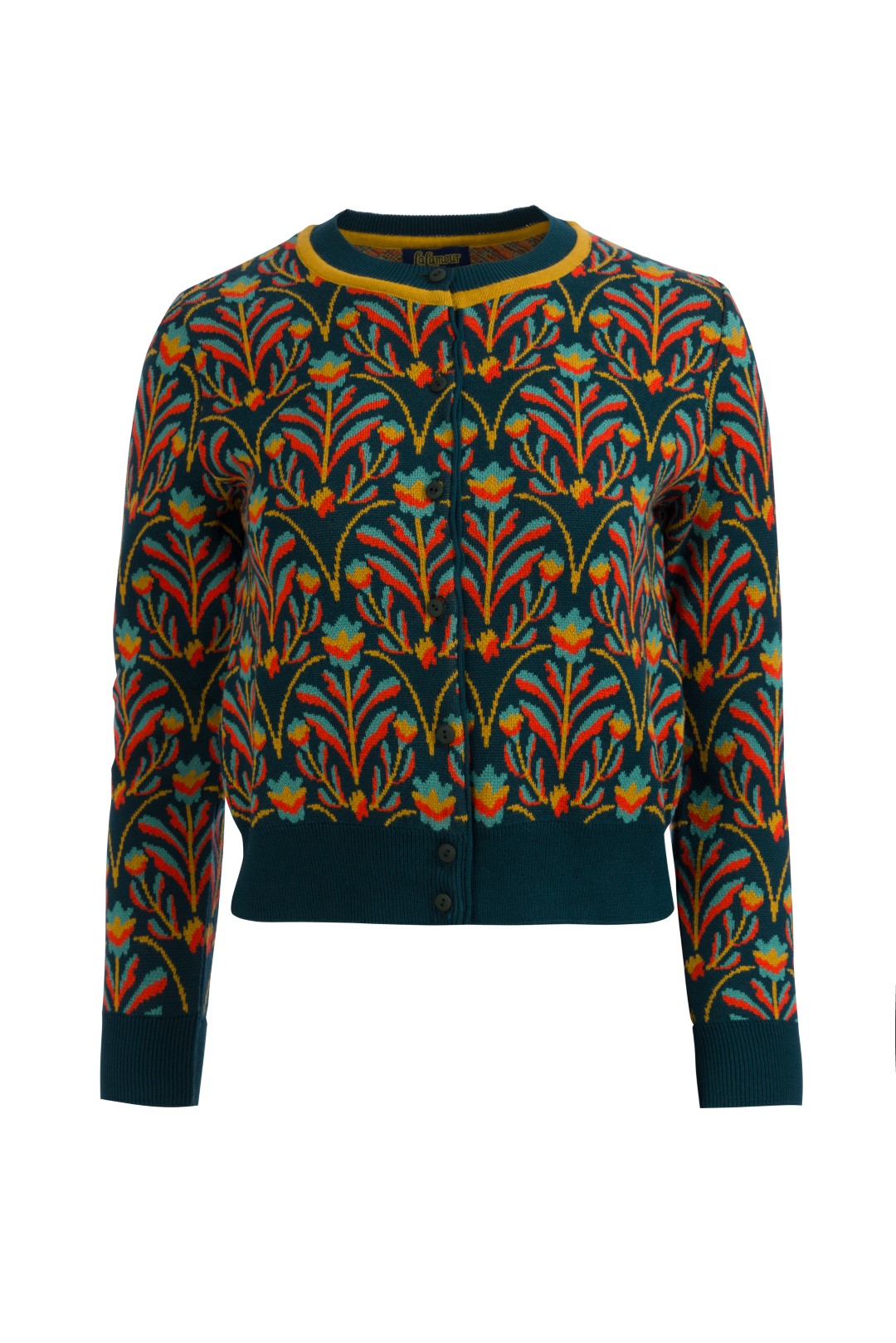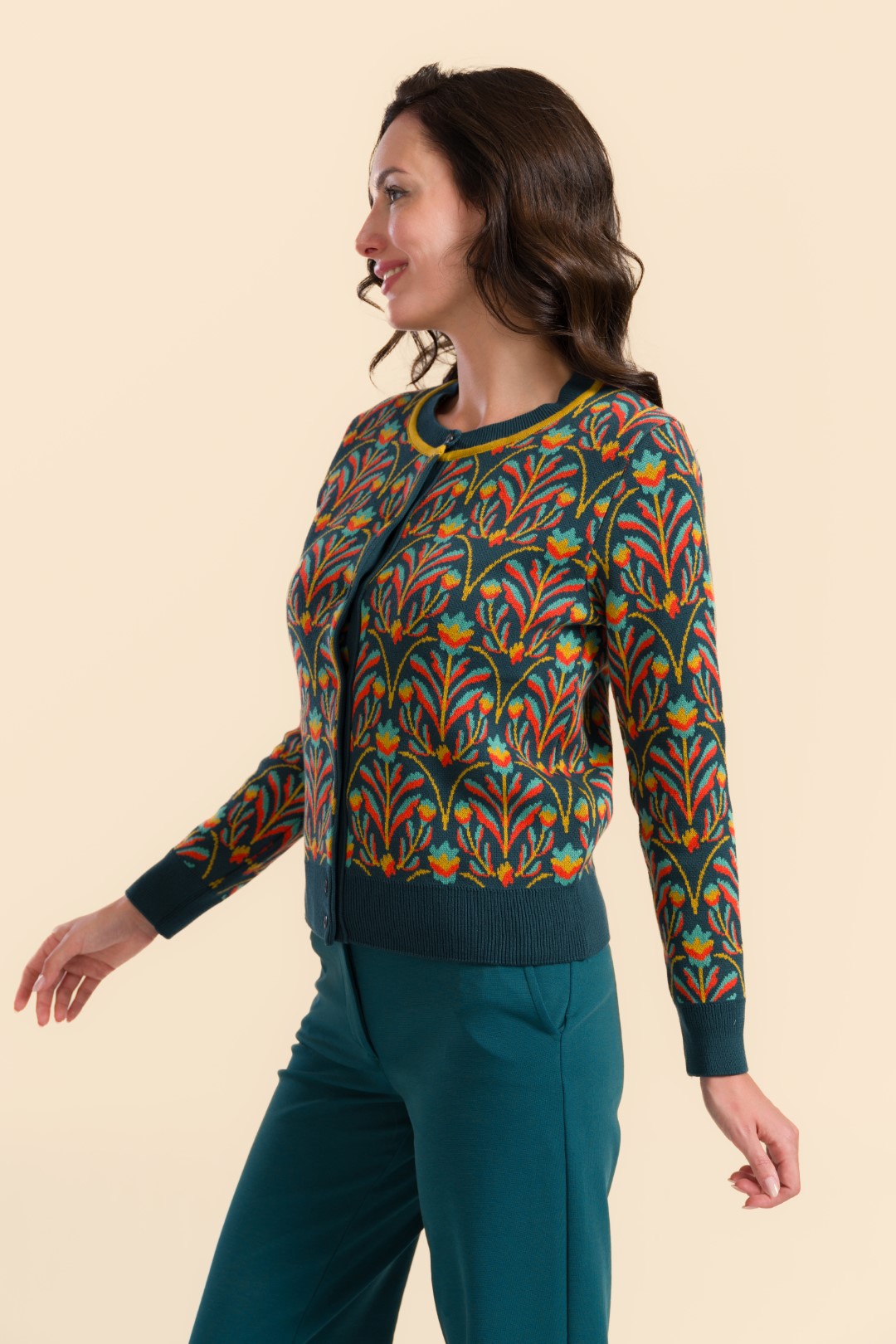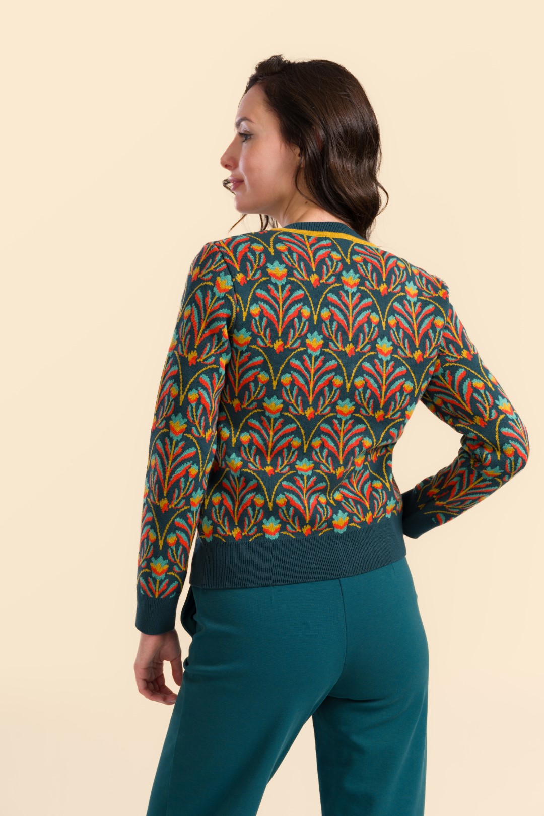 De Knitwear Cardigan – Barock Flower is een echte blikvanger! Het rijke barokke bloemenmotief in warme, contrasterende tinten geeft dit vest een elegante, artistieke uitstraling. De diepe petrolgroene basis maakt hem stijlvol én veelzijdig.
