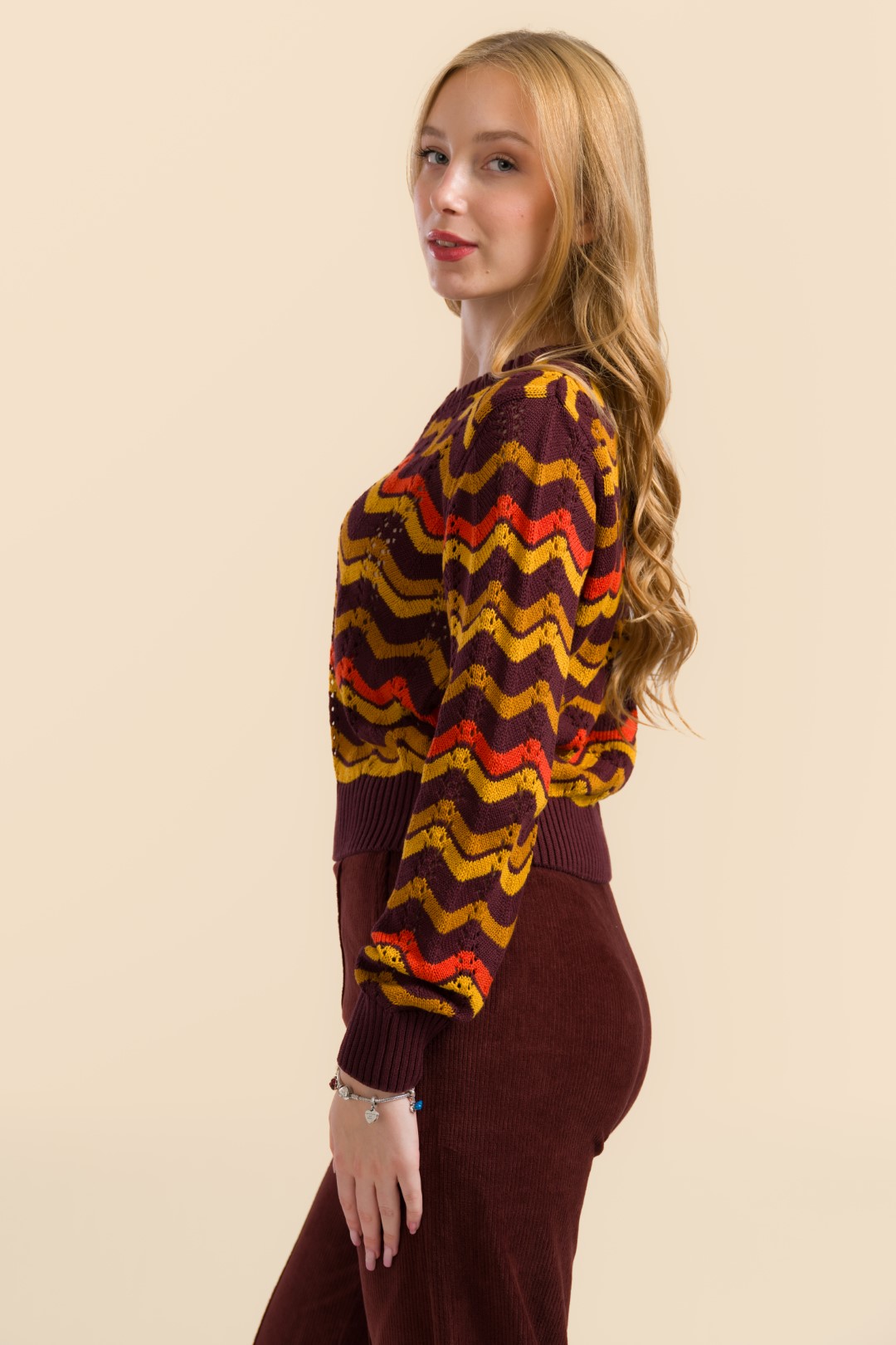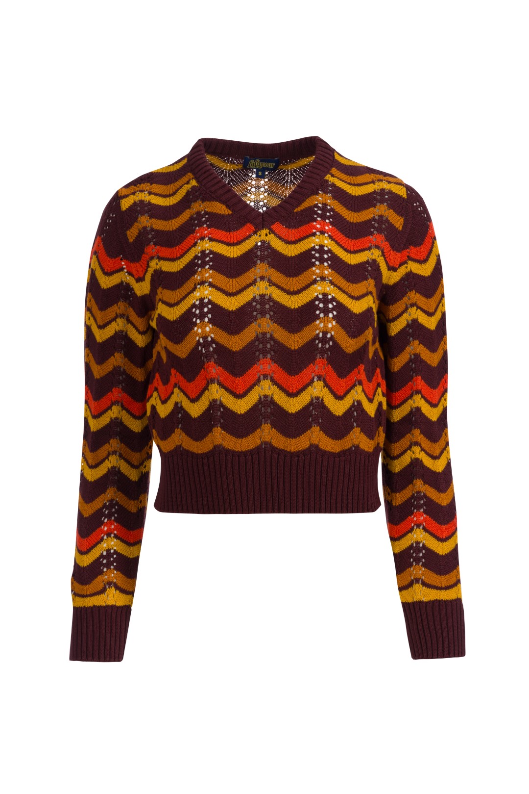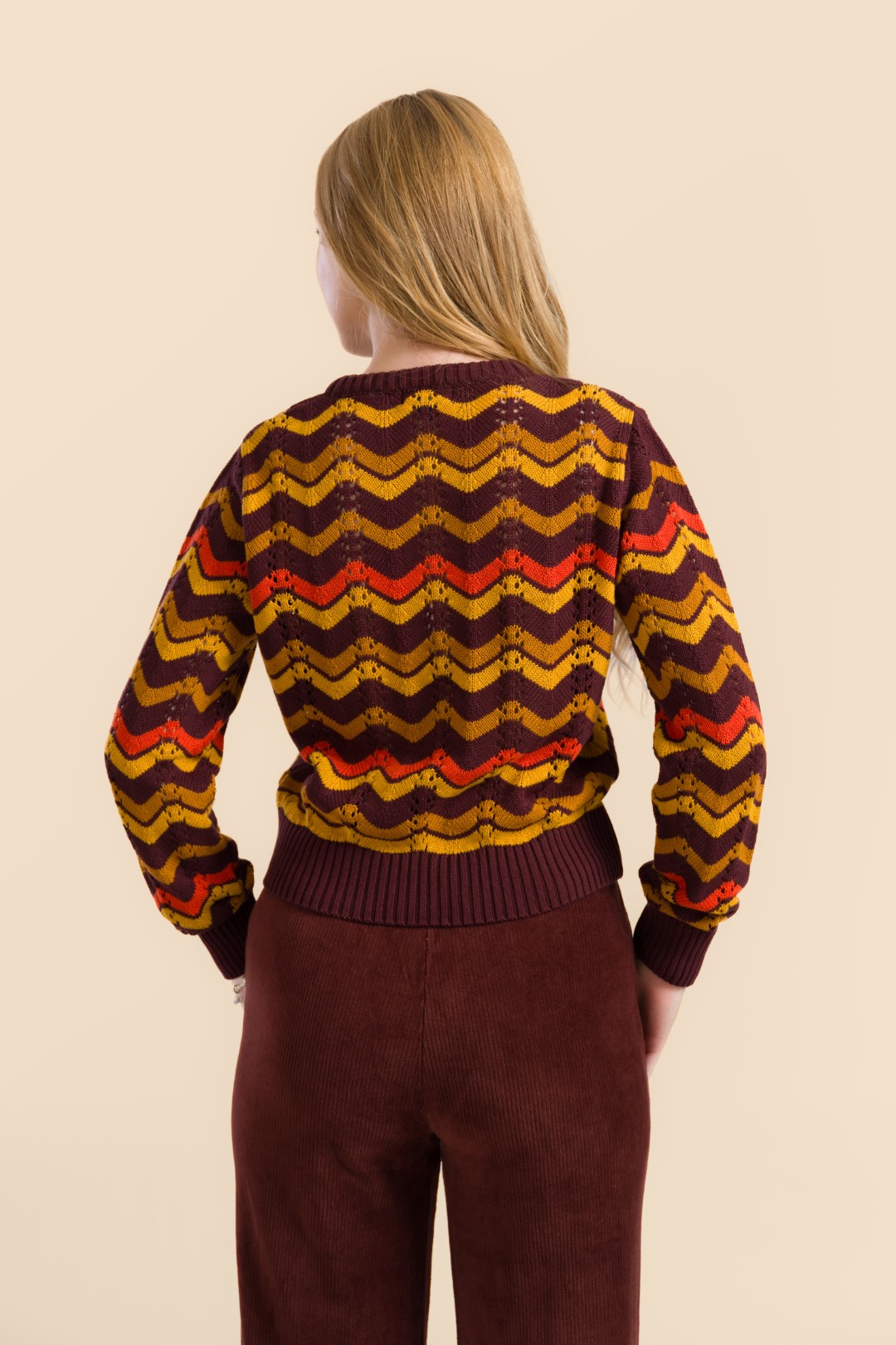 De Knitwear Sweater – Zig Zag brengt instant retro vibes met zijn golvende zigzagpatroon in warme herfsttinten: mosterdgeel, roestoranje en diep bordeaux. Een echte blikvanger met een speels en nostalgisch karakter.