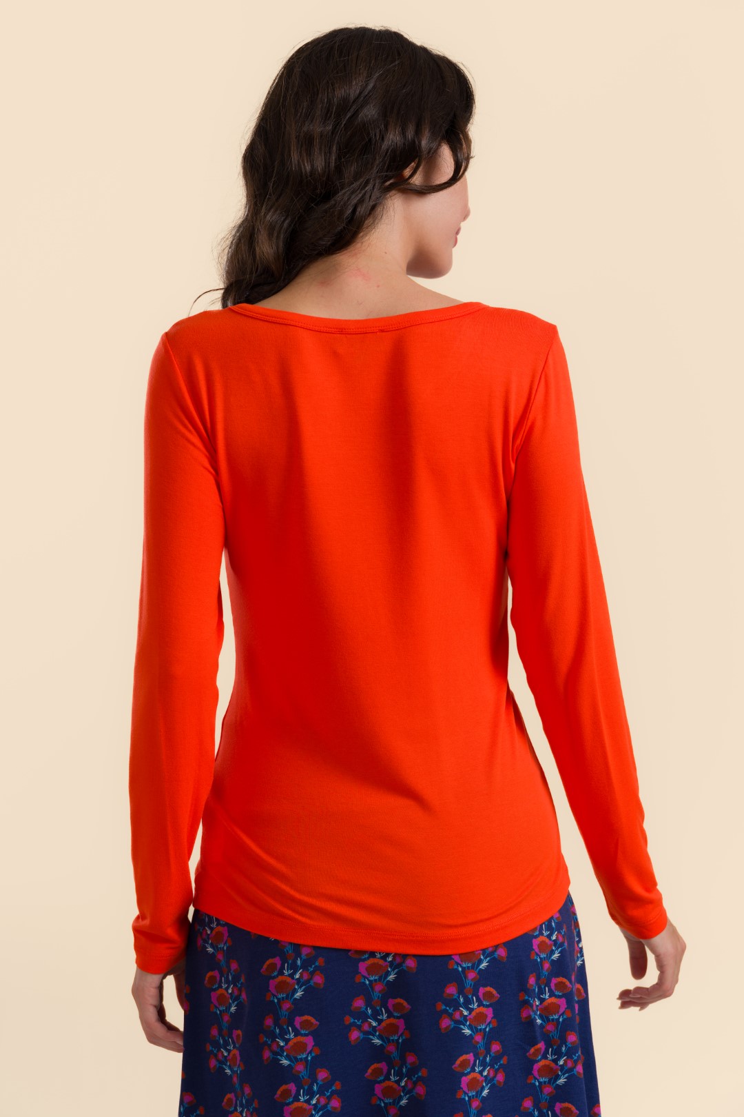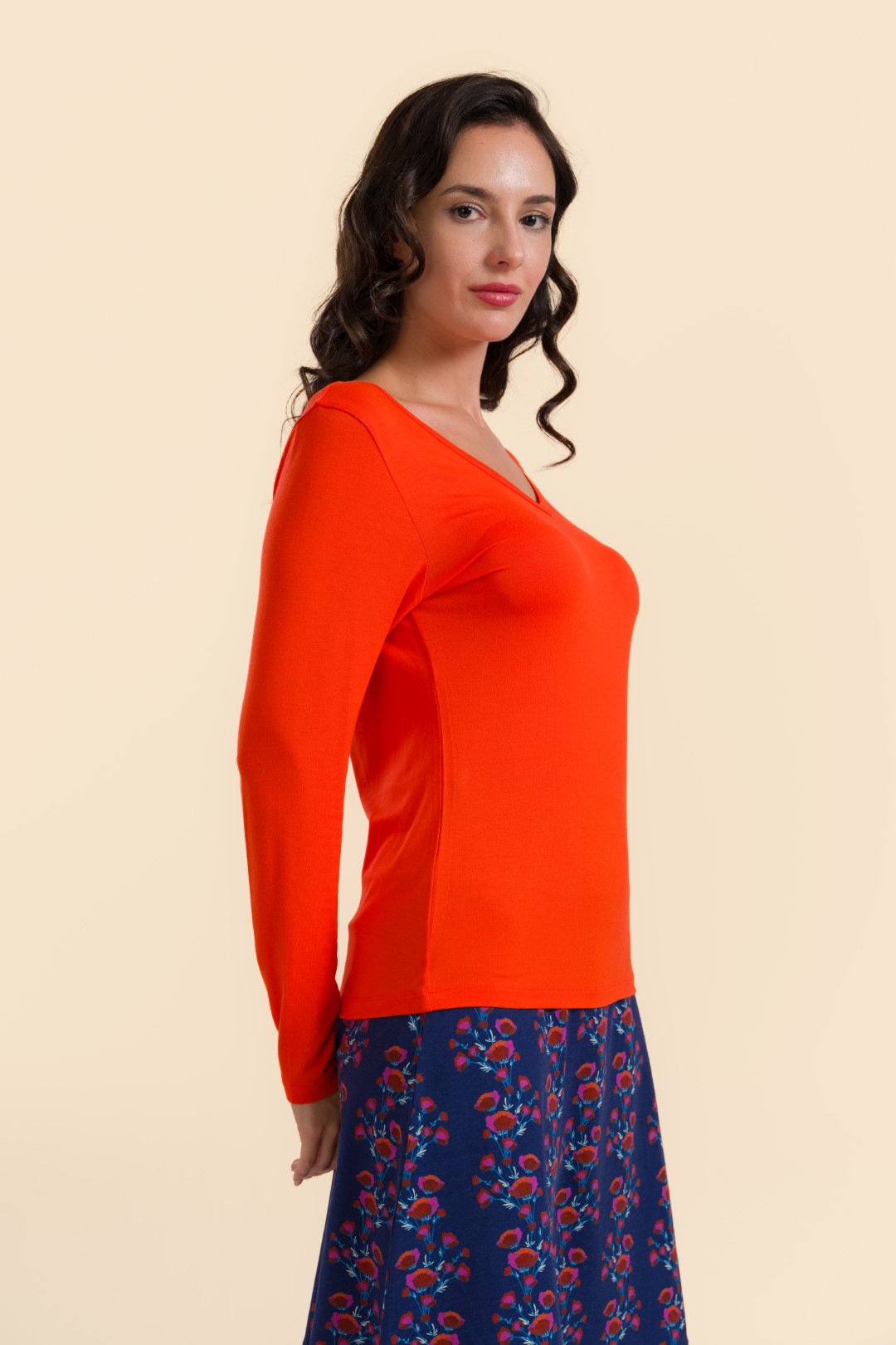 De Lynn Top – Red brengt energie en warmte in je outfit. Met zijn krachtige rode kleur en zachte, duurzame stof is deze top een echte eyecatcher én een comfortabele basic voor elke dag. De V-hals geeft een vrouwelijk accent, terwijl de lange mouwen zorgen voor veelzijdigheid in elk seizoen.