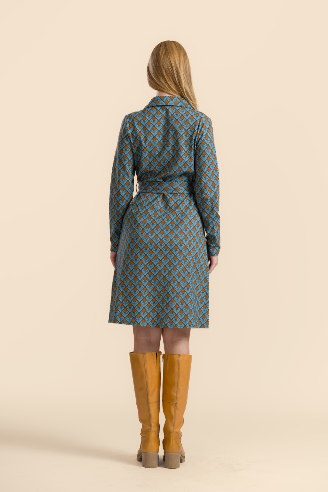 De Monique Dress – Jungle Green Flower is een elegante overhemdjurk met een speels geometrisch bloemmotief in groentinten. Dankzij de rechte pasvorm en de afneembare strikceintuur kun je zelf kiezen of je de jurk los en luchtig of meer getailleerd draagt.