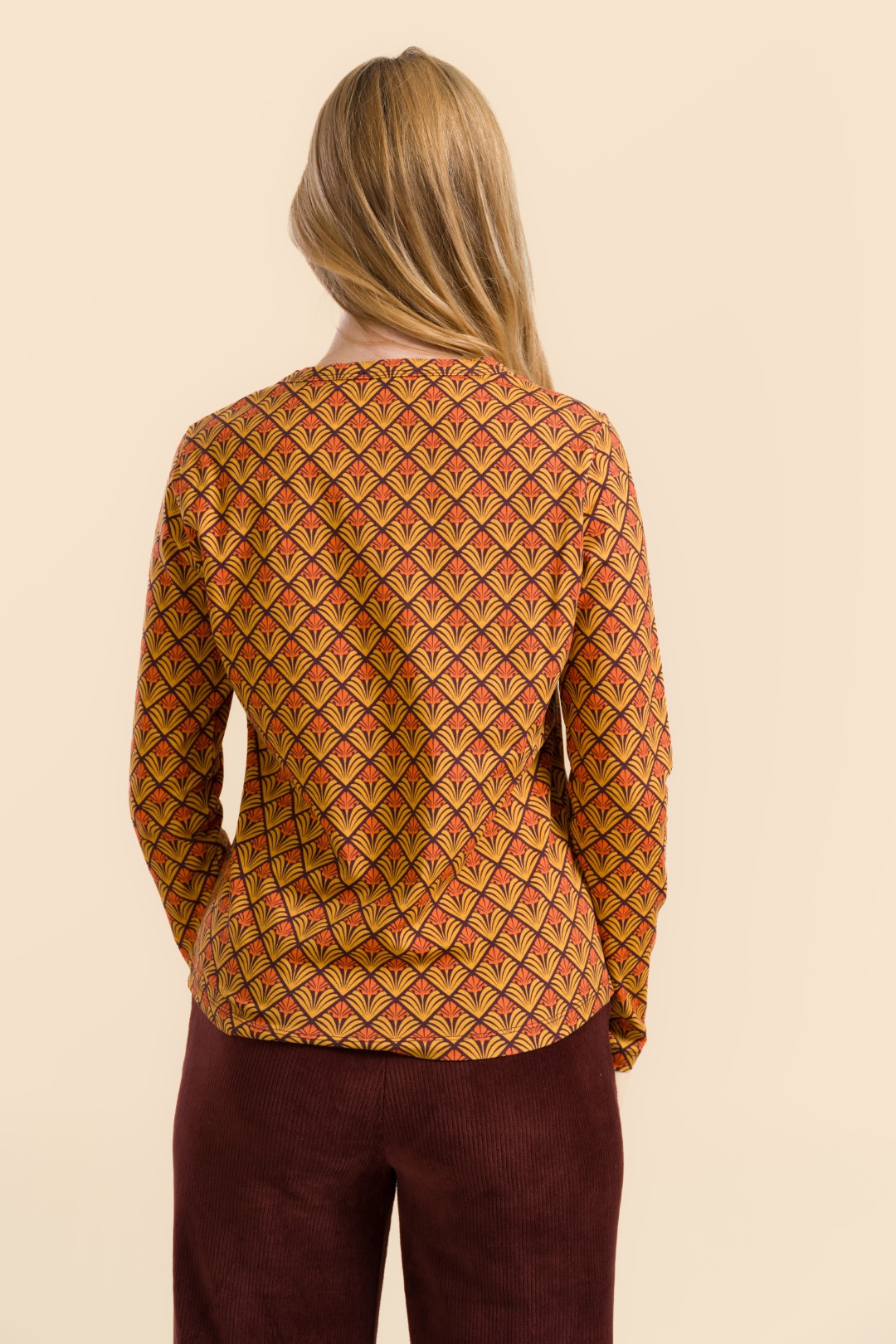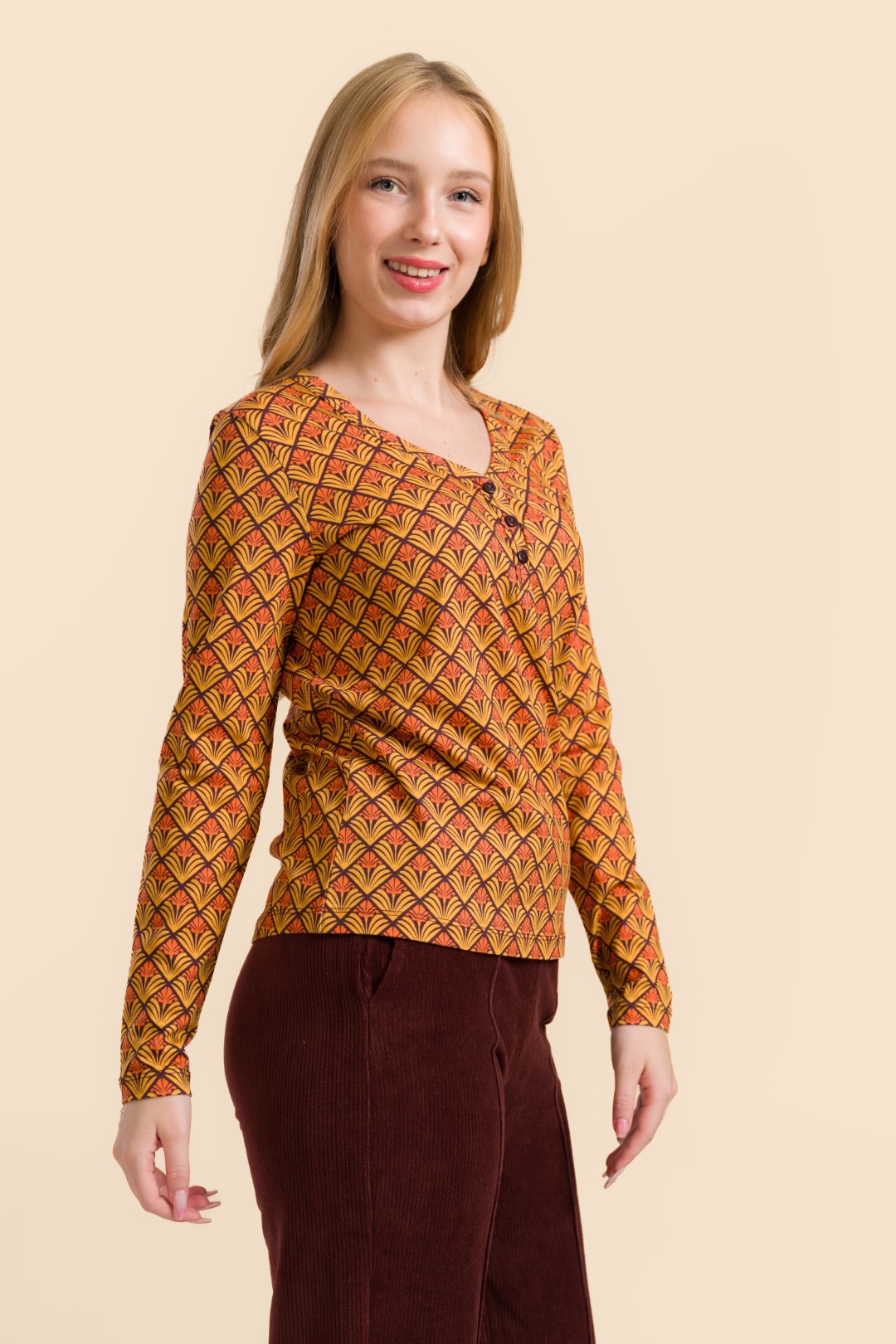 De Natalie Top – Retro Flower is een vrolijke longsleeve top met een retro bloemenpatroon in warme oranje- en geeltinten. Het V-hals design met kleine knoopjes en de zachte stretchstof geven de top een speelse én vrouwelijke uitstraling. Een veelzijdige basic met een retro twist!
