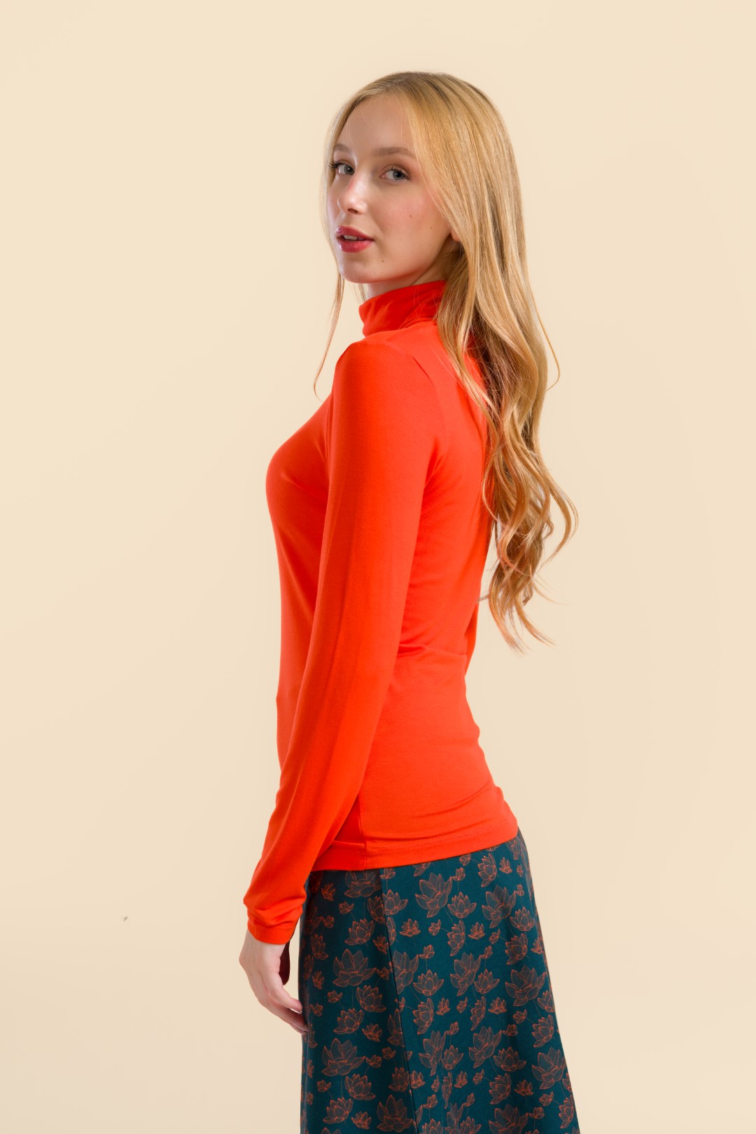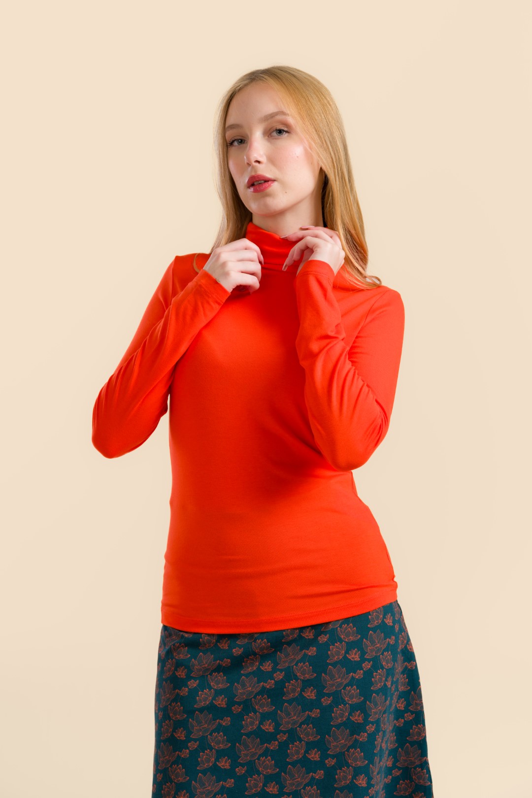 De Ruby Top LS – Ecovero Plain red is een elegante coltrui die niet mag ontbreken in je garderobe. De top is gemaakt van duurzame Ecovero viscose, wat zorgt voor een zachte, ademende en comfortabele stof met een lichte stretch. Het slim-fit model sluit mooi aan op het lichaam en de colkraag geeft de top een stijlvolle en tijdloze uitstraling.
