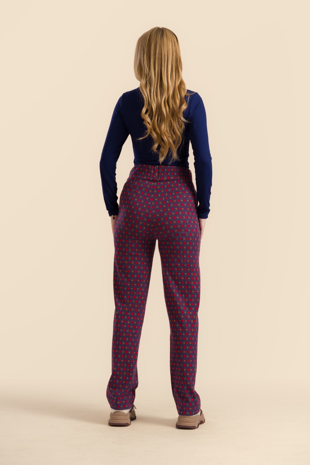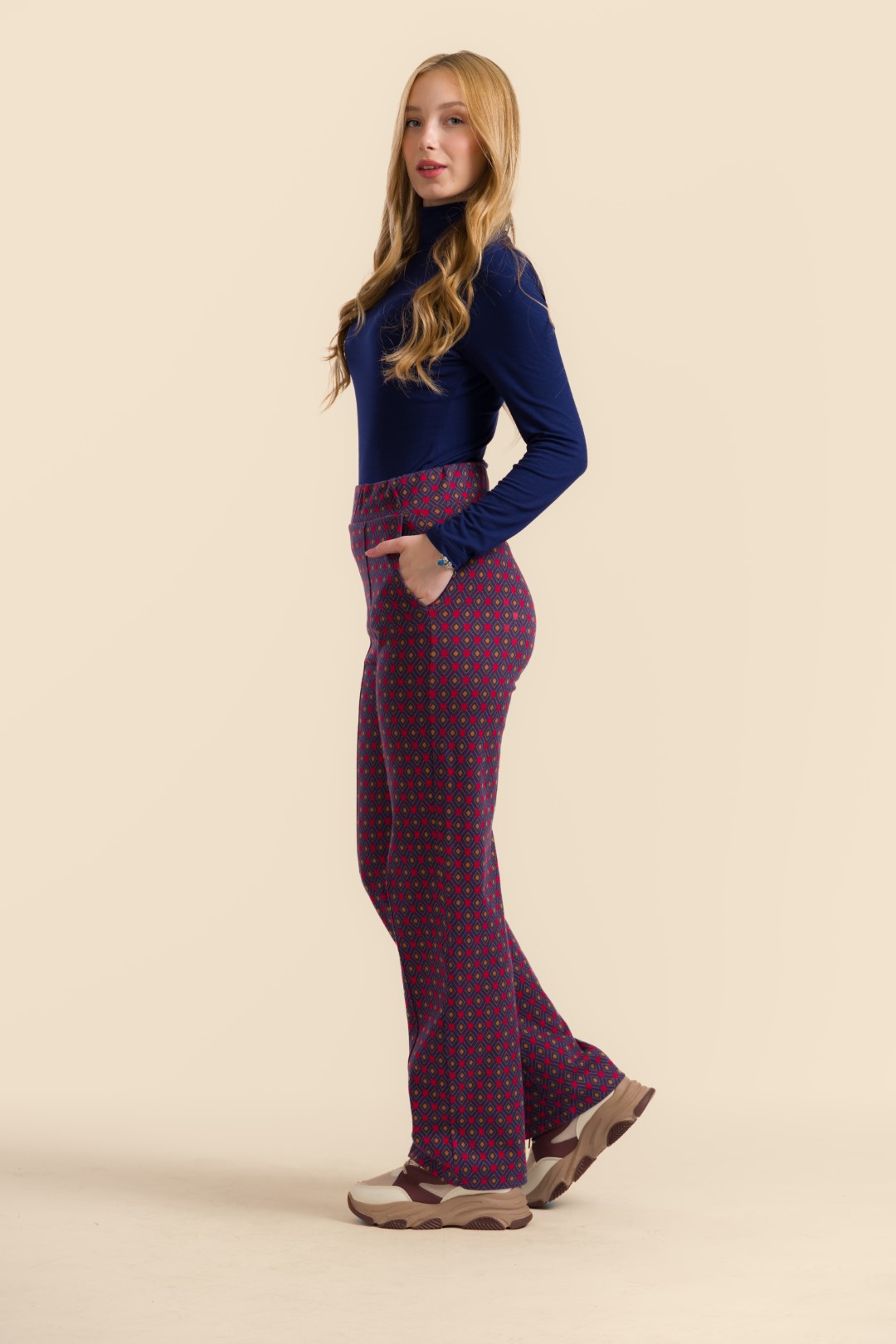 Speels en uniek: de Jacquard Hearts print combineert warme tinten met een subtiel hartjespatroon. Deze broek voegt een vrolijke en stijlvolle twist toe aan je outfit.