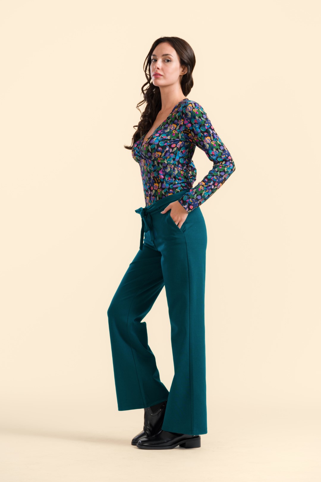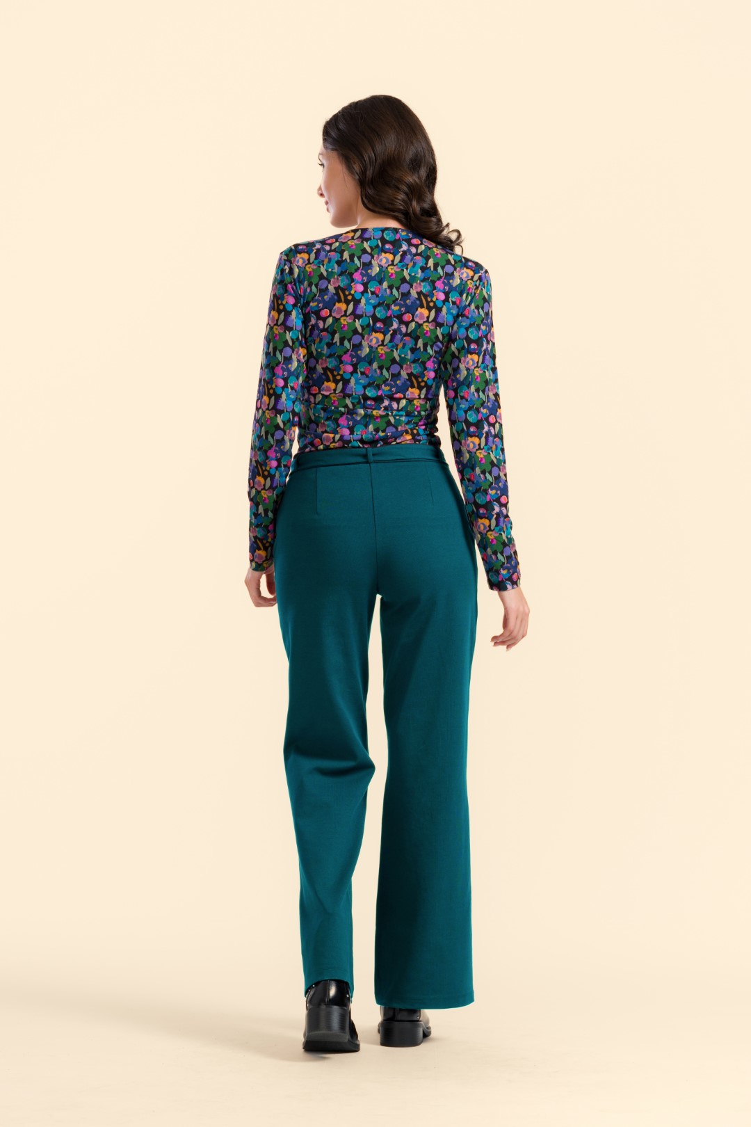 Combineer de petrol Sue Trousers met een blouse met een vrolijke print of een basic top voor een frisse, trendy look.